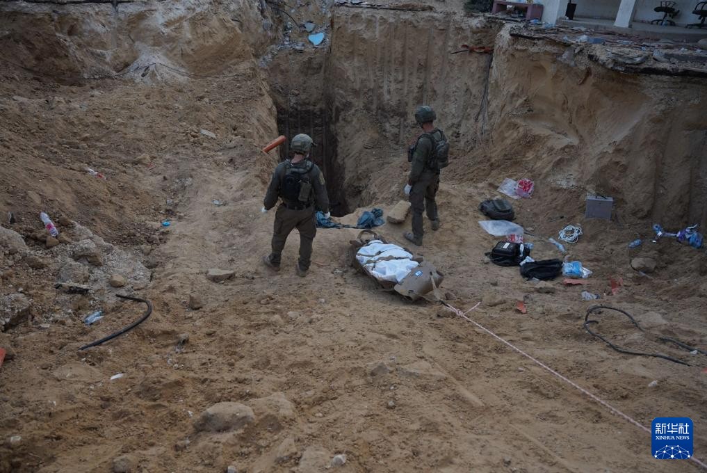 這張以色列國防軍6月8日發佈的照片顯示,以軍士兵在位於加沙地帶南部汗尤尼斯的歐洲醫院地下隧道外轉移穆罕默德·辛瓦爾的遺體。新華社發(以色列國防軍供圖)