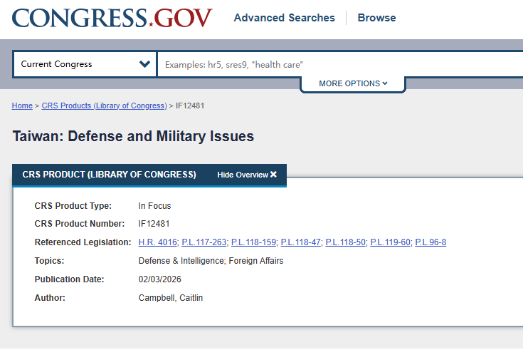 這是美國國會研究處2月3日發佈的涉台報告(美國國會在線數據庫網站截圖)