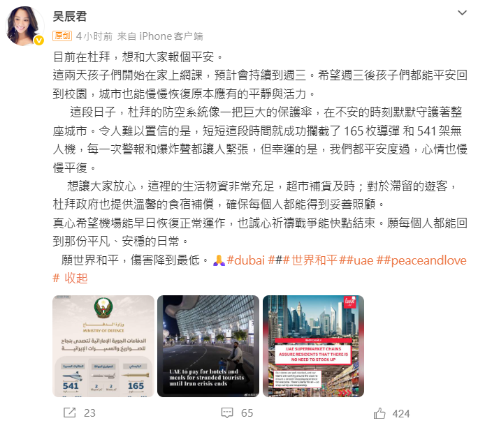面對孩子驚恐的眼神,吳辰君只能強忍淚水,故作鎮定。她稱,一向不愛讓孩子以卡通打發時間的她,當晚破例讓孩子緊盯螢幕,希望那些彩色畫面能像一道防護牆,隔絕門外的恐慌。“新聞裡陸續傳來導彈的消息與不遠處的火光,想到這片土地的動盪,眼淚幾乎忍不住。”面對外界關心,吳辰君今日(2日)下午也通過社交平台微博向大家報平安,表示所幸目前迪拜的水、電與食物供應尚屬正常,“這兩天孩子們開始在家上網課,預計會持續到周三(4日)。希望周三後孩子們都能平安回到校園,城市也能慢慢恢復原本應有的平靜與活力。”她也在努力維持生活節奏,希望大人穩住,孩子的世界就能安全。